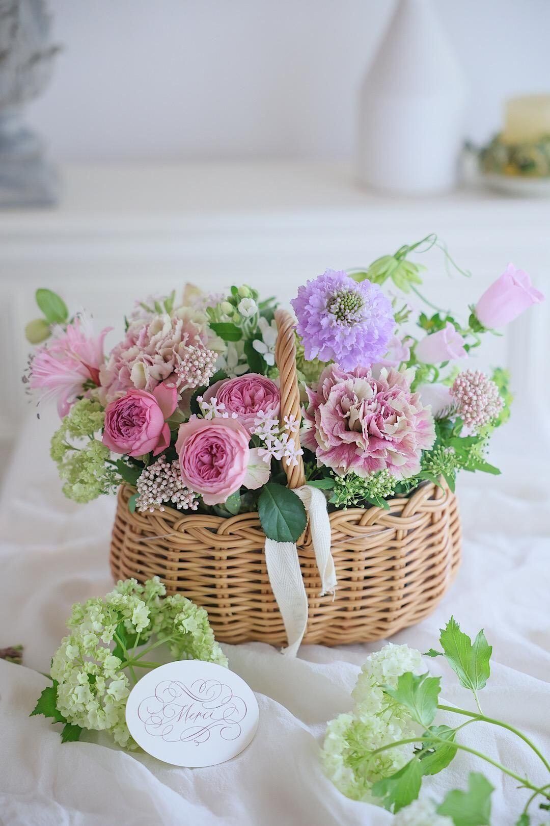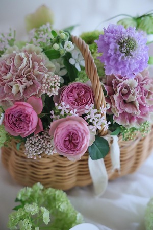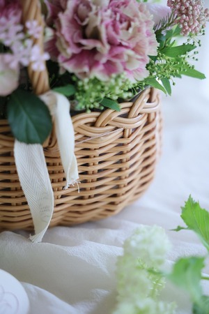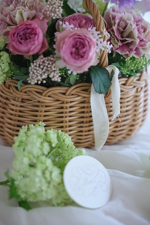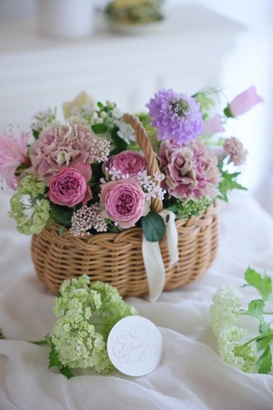 「パニエS」(お花を含むおおよその サイズ横約30センチ 奥行約22センチ 持ち手含む高さ約25センチ)のご注文を承わっております。
