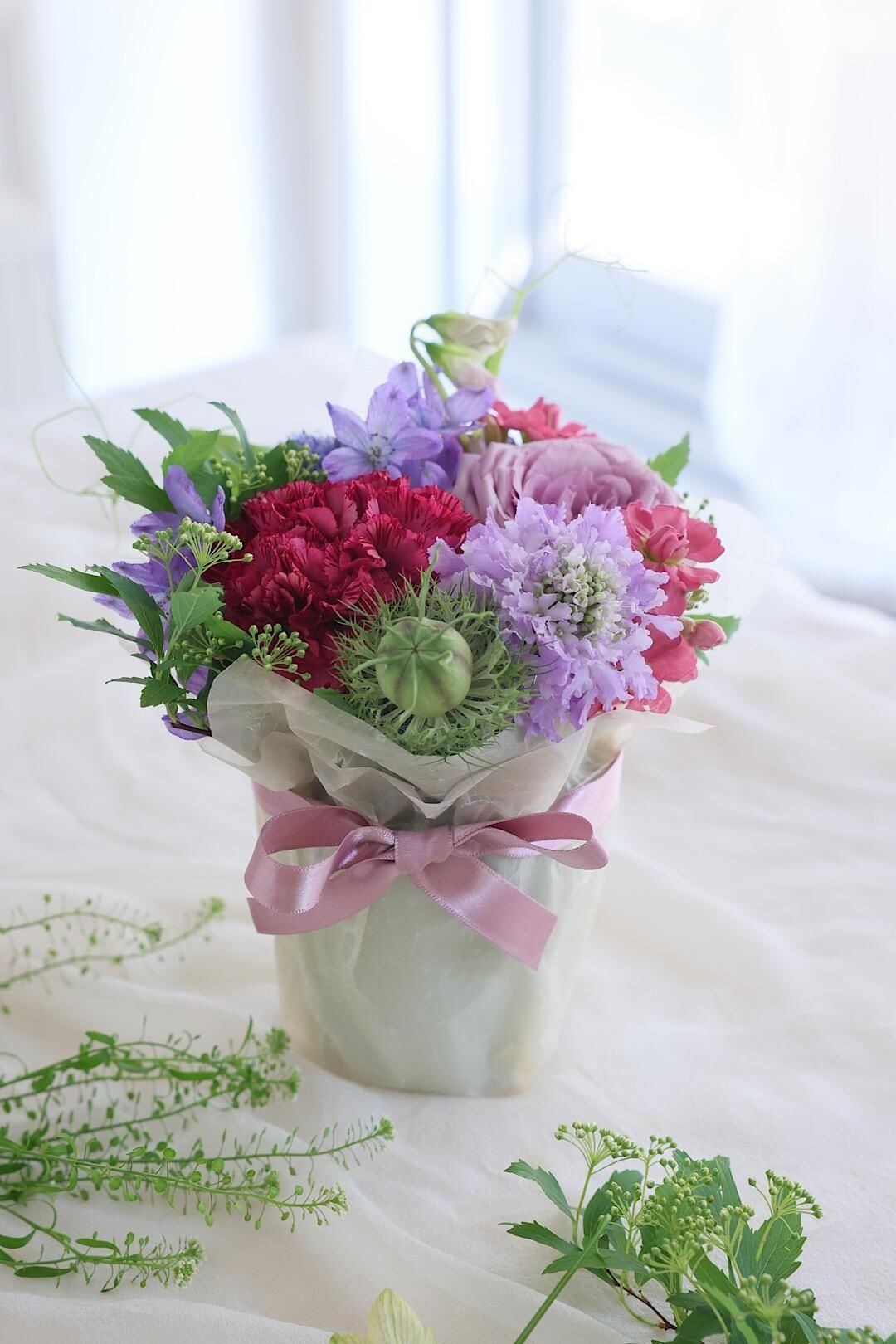 季節のお花やカーネーションを入れてナチュラルに仕上げます。