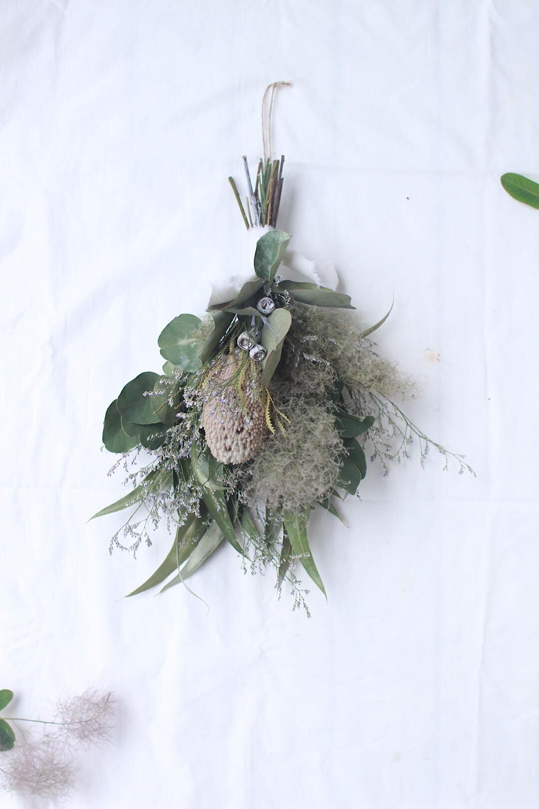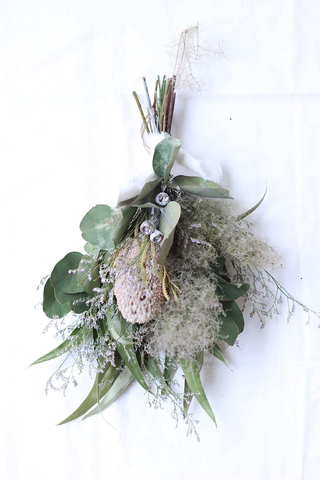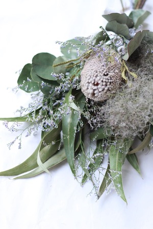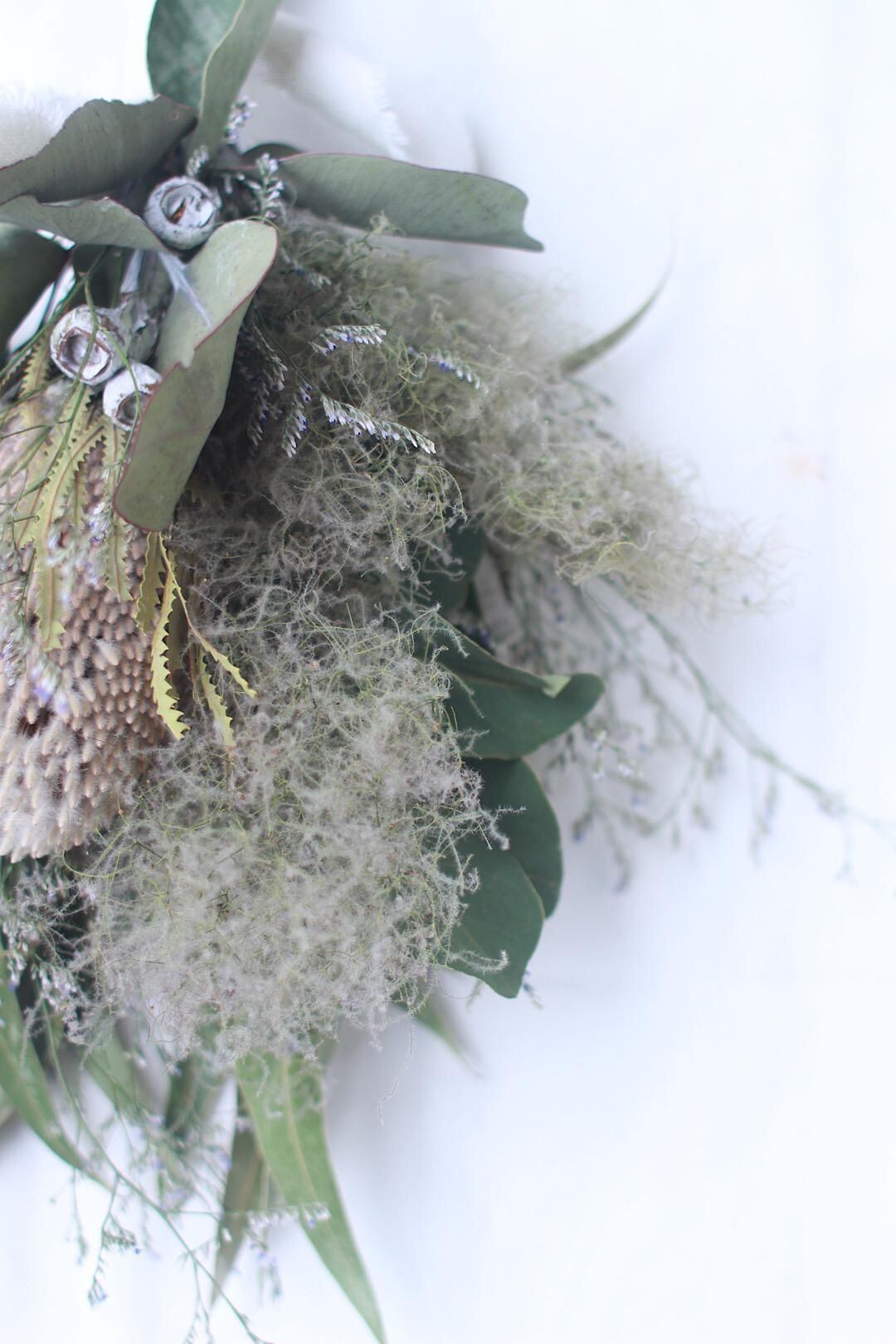 ネイティブフラワーのバンクシアを中心にスモークツリーやユーカリをあしらったスワッグです。